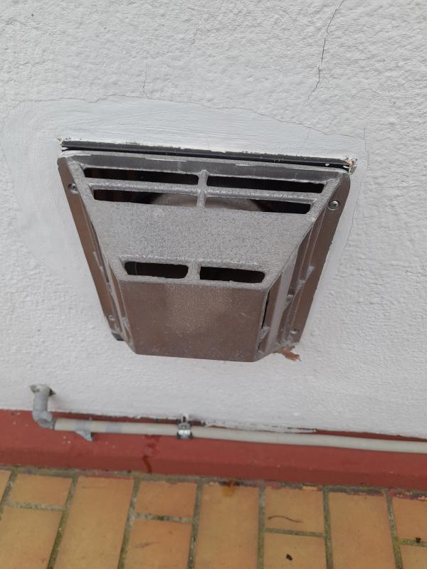 Somit habe ich das Gerät nach draußen verbannt, für den Warmluftschlauch eine Kernbohrung von 8 cm durch den Kalksandstein der Außenwand gefertigt und das Netzteil im Innenbereich auf der Fensterbank belassen. Der Stromverbrauch ist übrigens abgesehen vom Start sehr gering.