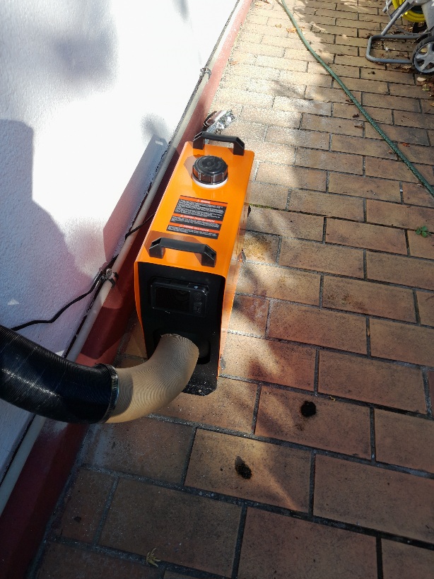 Die Erfahrung mit diesem Ofen fehlte mir noch und deshalb habe ich mir für einen Hunderter zu Testzwecken einen China-Nachbau einer allseits bekannten Standheizung für PKWs mit ca. 5 kW Leistung zukommen lassen. Das Gerät ist für 12V/max. 15A ausgelegt und hat ein separates Netzteil für 230V. Bemerkenswert ist insbesondere, dass im Gegensatz zu den mir bekannten Petroleumöfen die Abgase getrennt von der erzeugten Warmluft über ein Rohr nach außen abgeführt werden können