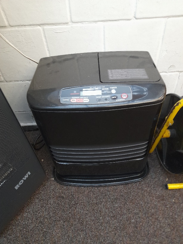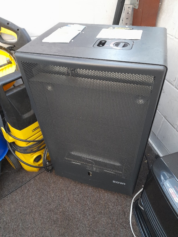 Da wären zunächst die Gasöfen mit katalyt- oder normalem atnosphärischen Brenner. Das sind mittelgroße Metallkisten auf Rollen und da steht hinten eine 11 kg- Propan-Gasflasche mit Druckminderer drin. Unten ist der Brenner mit manueller oder thermostatgesteuerter Regelung mit einer Leistung bis zu 8 kW und das wars schon. Ein Anschluss ans Stromnetz ist nicht vorgesehen und deswegen gibt es auch keinen eingebauten Ventilator. Die Heizleistung ist selbst für eine kleinere Versammlungsstätte meistens ausreichend.