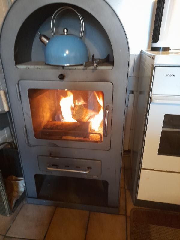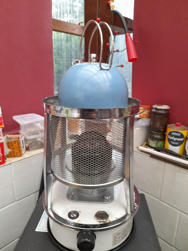 Das Gerät habe ich im "Wohnraum" der Laube neben dem Kaminofen auf den nicht brennbaren Herd gestellt und das Abgasrohr (ca.32 mm Durchmesser) provisorisch in den Kaminofen (derzeit natürlich außer Betrieb) eingeführt.